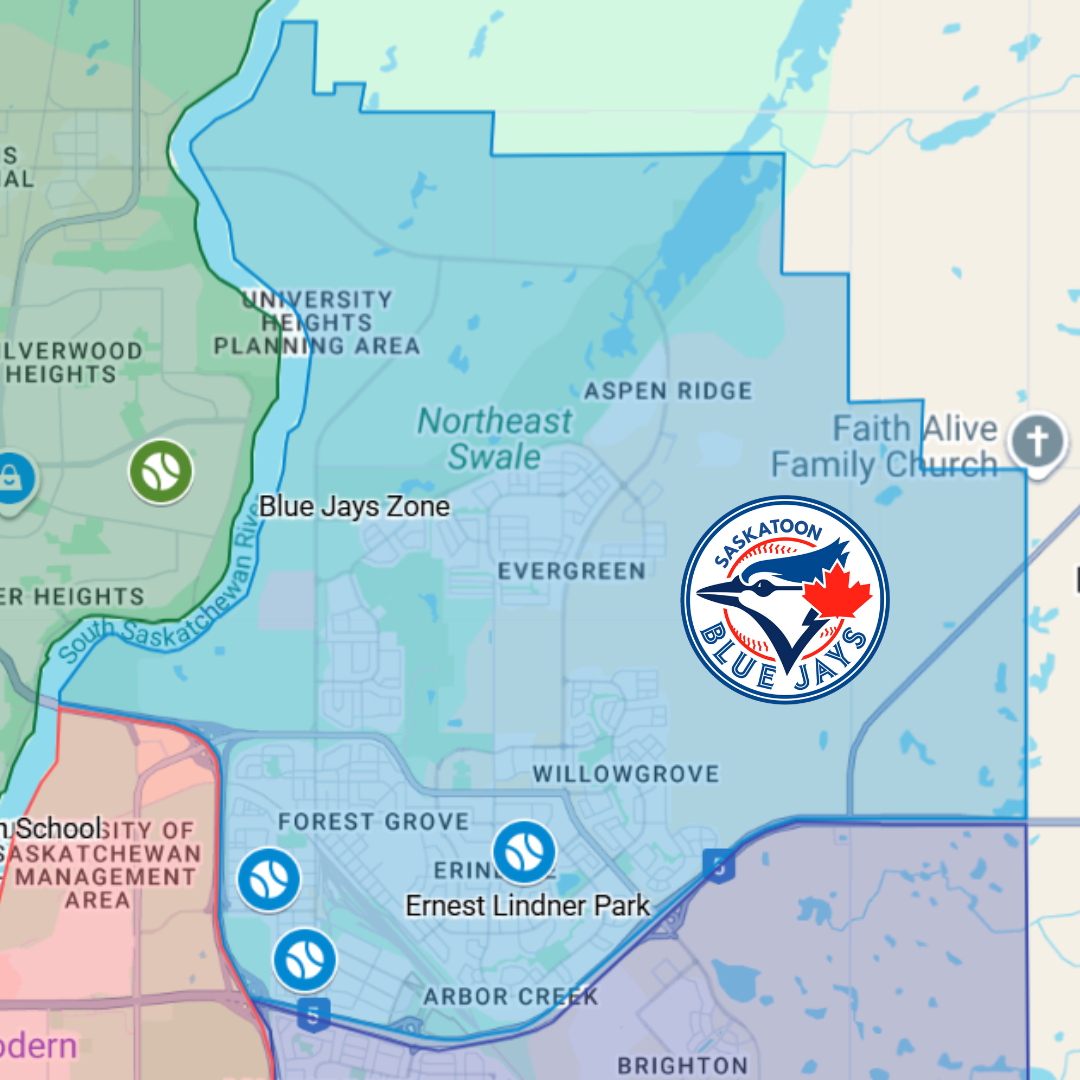 The Saskatoon Blue Jays zone is located as indicated in the blue shaded area on the map below. If your place of residence is within this blue area, your child will register as a Saskatoon Blue Jay.