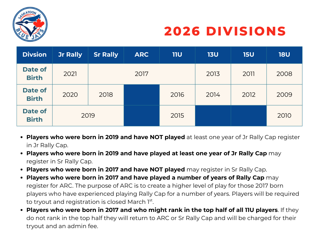 All registration will be online through our website, with registration fee payment through online credit card only. Those who cannot access online registration or cannot register via credit card can contact the registrar, Madi Yurach Pikaluk, for registration purposes at registrar@saskatoonbluejays.com. Avoid late registration fees and register as early as possible.